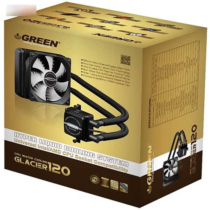 خنک کننده پردازنده مرکزی Glacier GLC120A شرکت گرین (Green)، یک خنککنندهی آبی است که از سیستم حلقه بسته (Closed Loop) استفاده میکند. در این خنککننده، از یک رادیاتور آلومینیومی 120 میلیمتری استفاده شدهاست که به نوبهی خود، سهم به سزایی در دفع گرمای پردازنده ایفا میکند. روی این رادیاتور آلومینیومی، یک عدد فن 120 میلیمتری استفاده شدهاست که هوای گرم وارد شده به درون رادیاتور را خنک کرده و به سمت منفذهای خروجی کیس هدایت میکند. بلوک تماس با پردازنده (CPU) از جنس مس خالص ساخته شده که کاملا با پردازنده در تماس است و مایع خنککننده پس از عبور از روی این بلوک تماس، به سمت رادیاتور انتقال داده میشود. بلوک تماس به وسیلهی یک جفت لولهی پلاستیکی از جنس FEP به طول 30 سانتیمتر به رادیاتور وصل میشود و میتوان فاصلهی مناسبی بین پردازنده و رادیاتور ایجاد کرد تا عملکرد هر یک از این اجزا، بر دیگری تاثیر منفی نداشتهباشد. این خنککننده را میتوان روی پردازندههای حرفهای و نیمه حرفهای از هر دو برند Intel و AMD نصب کرد و با ایجاد محیطی خنکتر برای پردازنده، طول عمر آن را افزایش داد. به کمک چنین خنککنندهای میتوان پردازندههای حرفهای را تا حدود زیادی اورکلاک هم کرد که این عمل، خود به رسیدن به کامپیوتری قدرتمندتر منجر میشود. درون بستهی این محصول، کفشکهای نصب روی سوکتهای مختلف قرار داده شدهاست که باعث میشود در نصب آن با مشکلی مواجه نشوید. به علاوه، یک عدد خمیر حرارتی (خمیر سیلیکون) هم همراه با محصول ارایه شده تا اتصال بهتری بین بلوک تماس و پردازندهی مرکزی برقرار شود و گرمای پردازنده به شکل موثرتری انتقال داده شود. این سیستم خنککننده را میتوان برای انجام اورکلاکهای منطقی تهیه کرد یا از آن برای ایجاد شرایطی بهتر از خنککنندههای مرجع برای پردازندهها استفاده کرد.